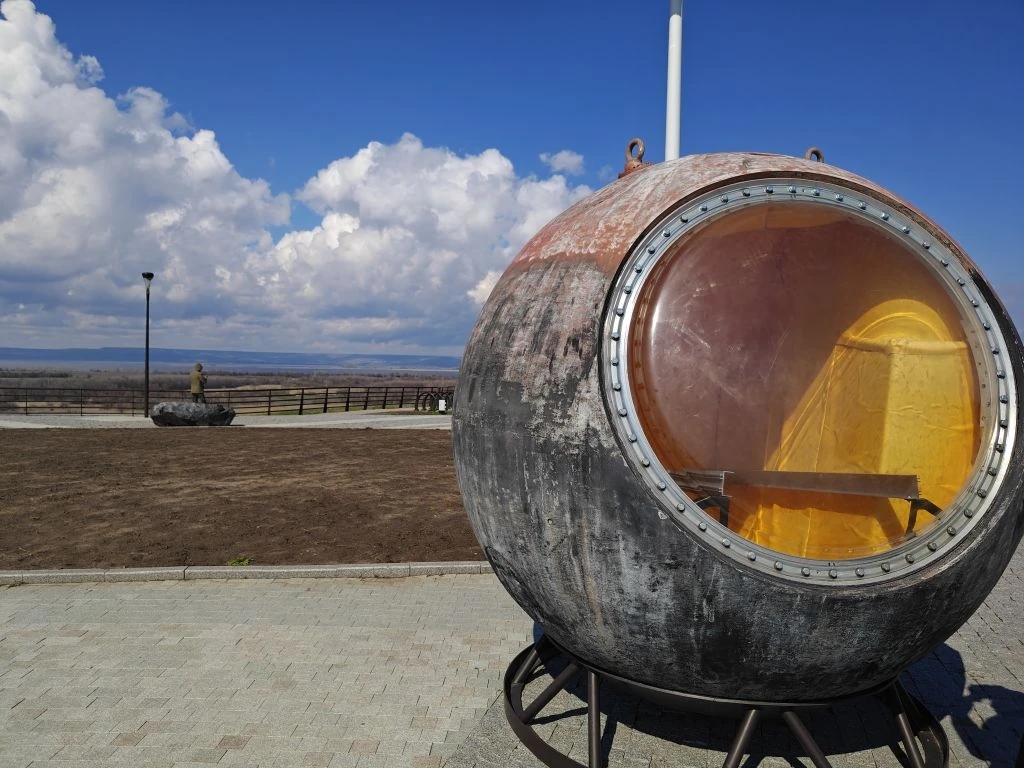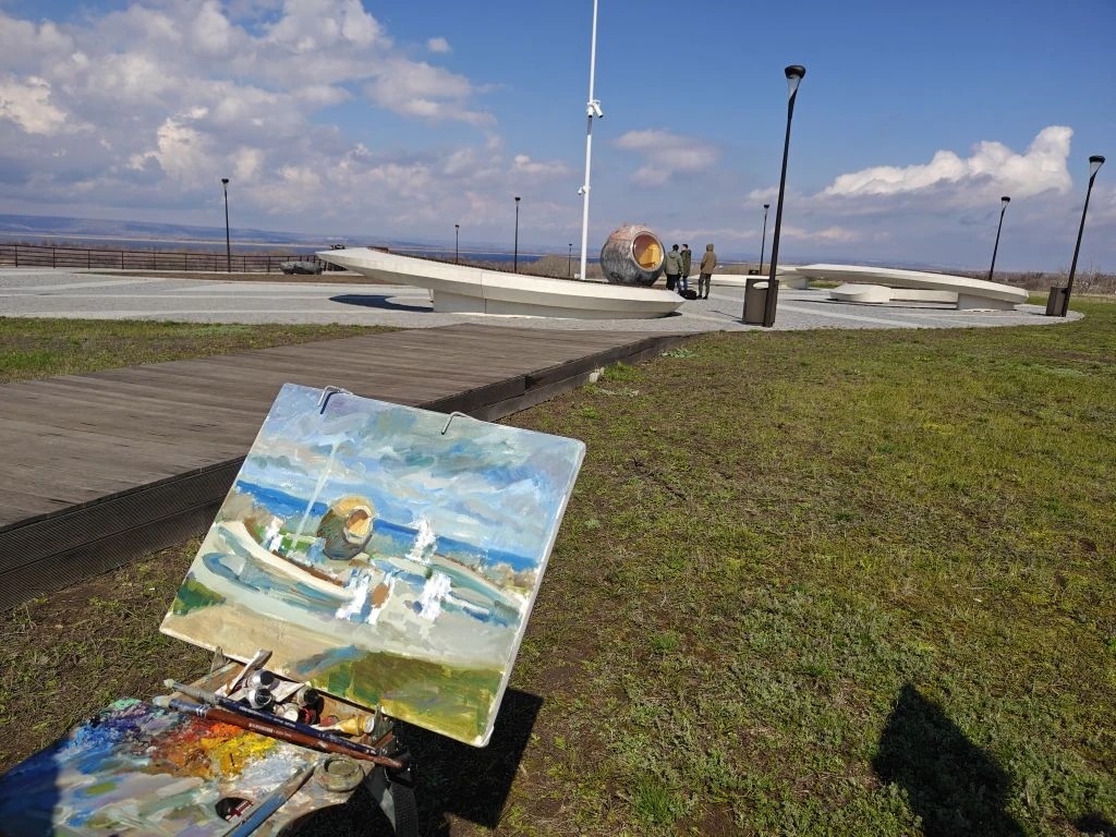 Пленэр развернулся у спускаемого аппарата, установленного на месте приземления Гагарина. С высоты смотровой площадки студенты увидели панораму Волги такой, какой её когда‑то видел космонавт. Здесь же расположены скамья «Орбита» и 15‑метровый «Маяк» с зеркальным наконечником, отражающим солнечный свет.